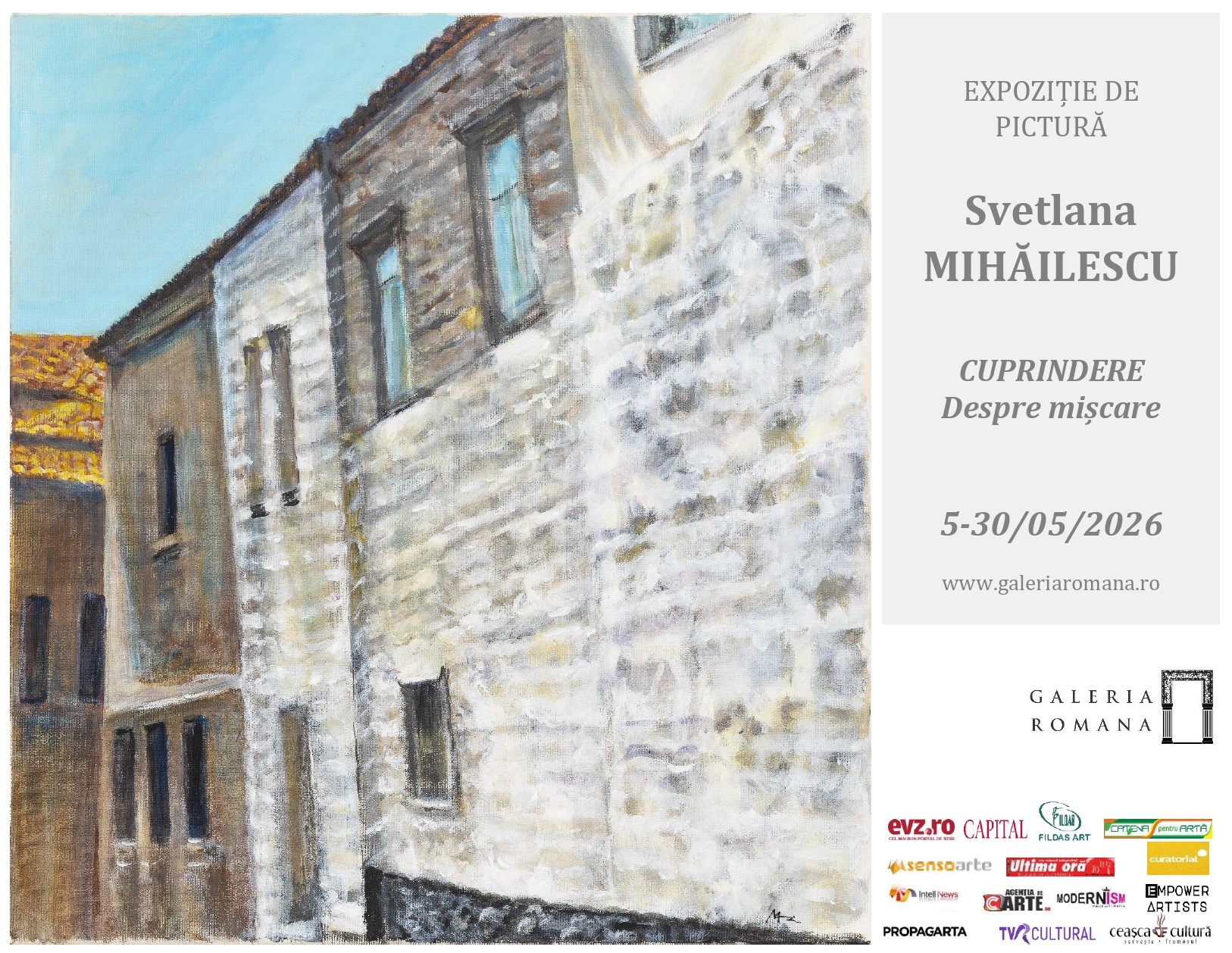 Galeria Romană vă invită la vernisajul expoziției „Cuprindere. Despre mișcare", semnată Svetlana Mihăilescu, care va avea loc marți, 5 mai 2026, începând cu ora 19:00 | Bd. Lascăr Catargiu, nr 1, sector 1, București.